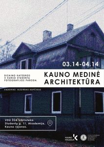 Iki balandžio 14 d. Vytauto Didžiojo Universiteto Žemės ūkio akademijos bibliotekoje (Studentų g. 11 – 235, Akademija, Kauno r.) veikia Kauno kolegijos Menų akademijos Dizaino studijų programos antrakursių fotografijų paroda „Kauno medinė architektūra“.