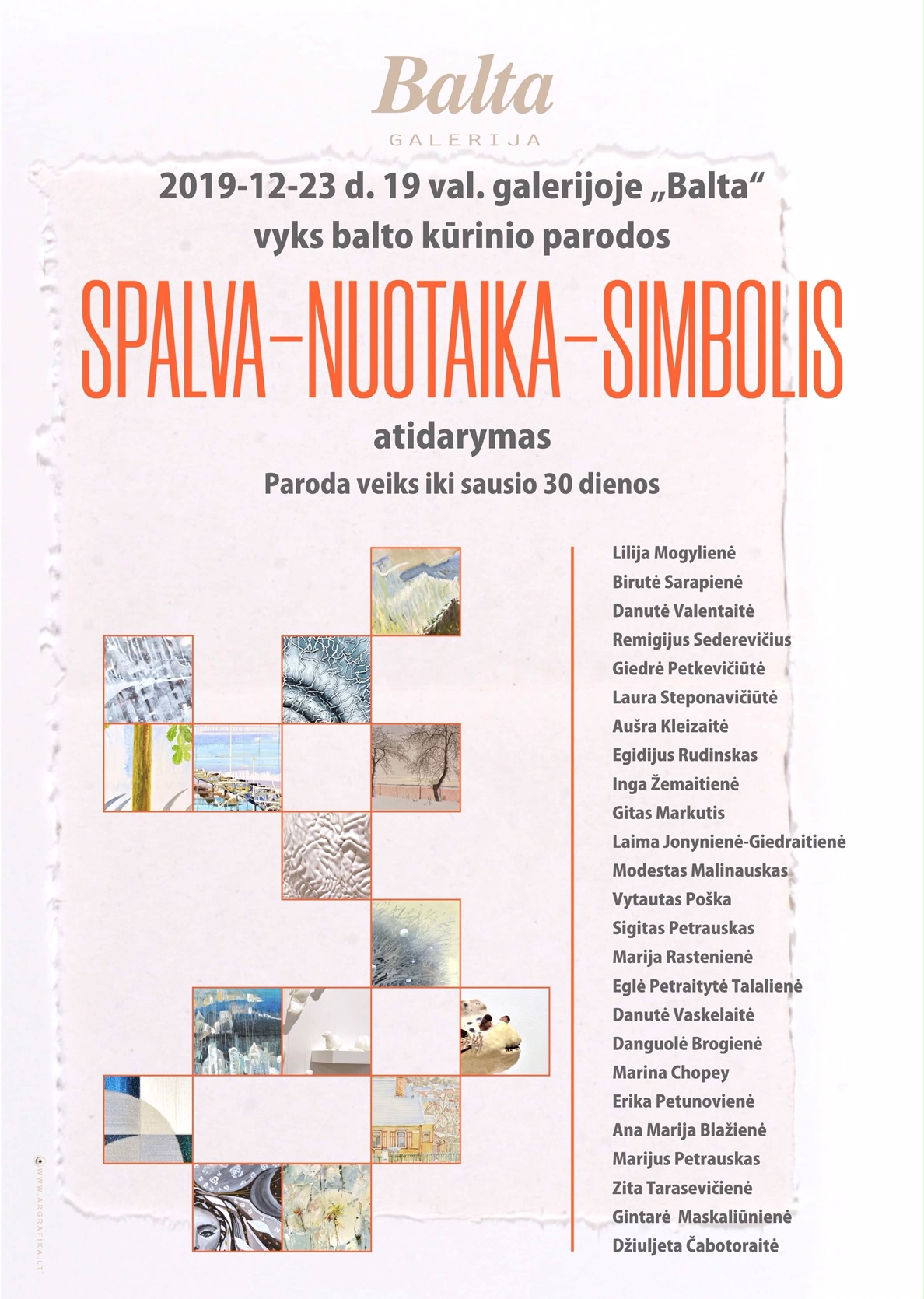 „Balta spalva simbolizuoja šviesą, džiaugsmą, sėkmę, išmintį ir amžinybę. Balta tai – prašviesėjimas, atvirumas, atlaidumas“, – taip poetiškai organizatorių pristatoma Tekstilininkų ir dailininkų gildijos galerijoje „Balta“ (M. Valančiaus 21, Kaunas) iki sausio 30 d. vykstanti konkursinė balto kūrinio paroda „Spalva – nuotaika – simbolis“, kurioje dalyvauja Kauno kolegijos Menų akademijos Stiklo, keramikos, odos, tekstilės meno studijų programos dėstytoja, tekstilininkė Birutė Sarapienė.