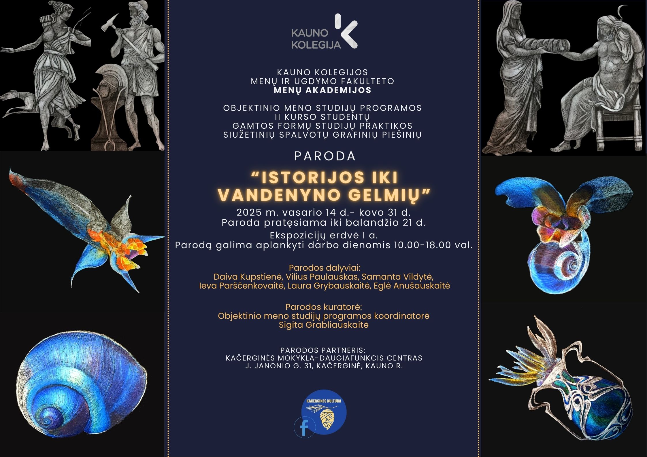 Kauno kolegijos Menų ir ugdymo fakulteto Menų akademijai bendradarbiaujant su Kauno rajono Kačerginės mokykla – daugiafunkciniu centru nuo 2025.02.14 d. iki 2025.03.31 d. (Paroda pratęsta iki 2025.04.21) bus eksponuojama Objektinio meno studijų programos II kurso studentų Gamtos formų studijų praktikos metu įgyvendintų siužetinių spalvotų grafinių piešinių paroda „Istorijos iki vandenyno gelmių“.