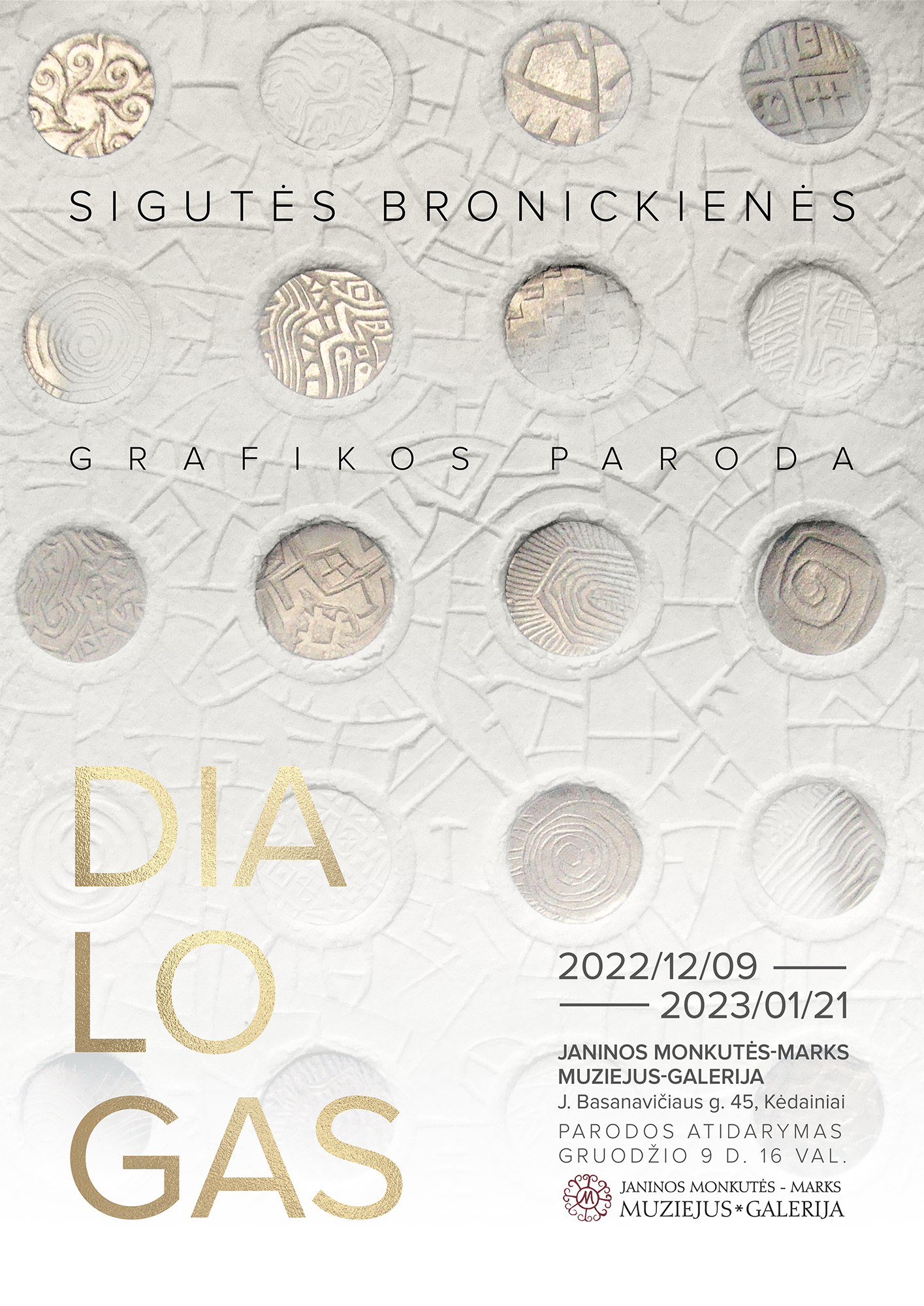Šiandien (gruodžio 9 d.) 16 val. Janinos Monkutės – Marks muziejuje-galerijoje (J. Basanavičiaus g. 45, Kėdainiai) atidaroma Kauno kolegijos Menų ir ugdymo fakulteto Menų akademijos Dizaino studijų programos lektorės, grafikės Sigutės Bronickienės personalinė grafikos paroda „Dialogas”.