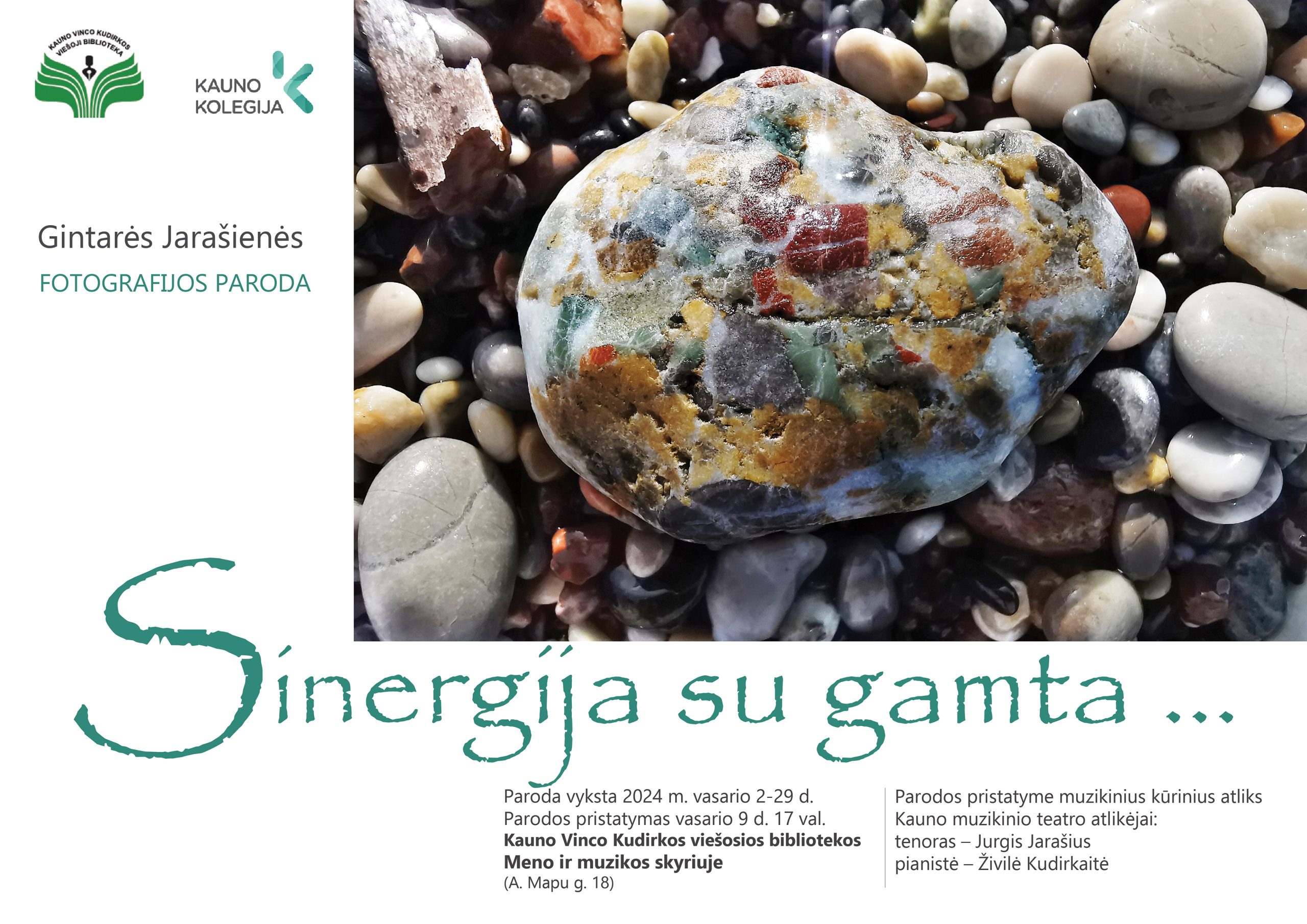 Vasario 9 d. 17 val. Kauno Vinco Kudirkos viešosios bibliotekos Meno ir muzikos skyriuje (A. Mapu g. 18, Kaunas) atidaroma personalinė Kauno kolegijos Menų ir ugdymo fakulteto Menų akademijos Dizaino studijų programos lektorės, dizainerės, meno licenciatės, Lietuvos dizaino asociacijos narės Gintarės Jarašienės fotografijos paroda „Sinergija su gamta…“. Dizainerė ne tik dirba grafinio dizaino srityje, aktyviai rengia personalines parodas, bet dalyvauja ir grupinėse parodose, konkursuose, įvairiuose respublikiniuose ir tarptautiniuose projektuose.