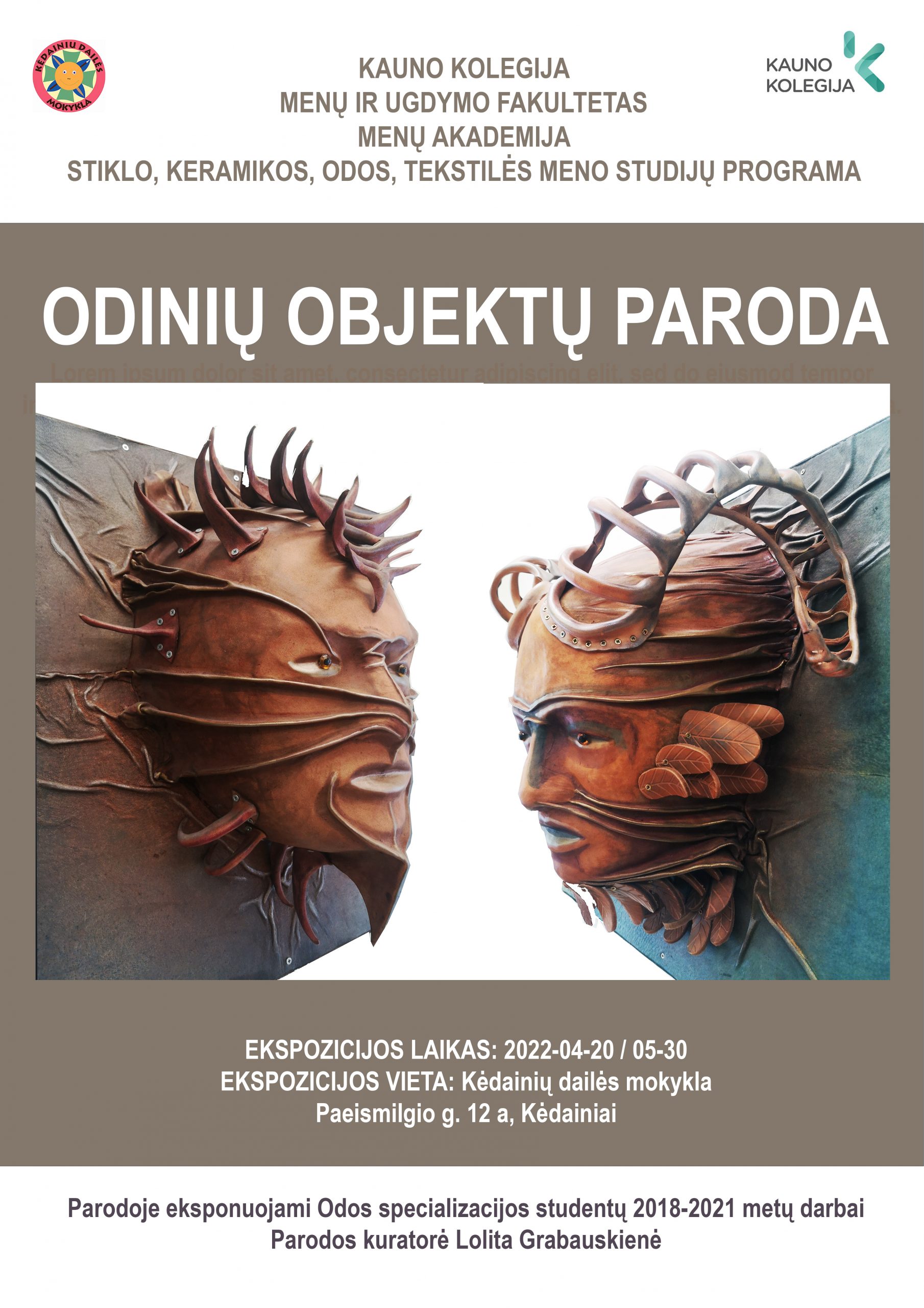 Iki gegužės 30 d. Kėdainių dailės mokykloje (Paeismilgio g. 12 a, Kėdainiai) eksponuojama Kauno kolegijos Menų ir ugdymo fakulteto Menų akademijos Stiklo, keramikos, odos, tekstilės meno studijų programos studentų odinių objektų paroda.