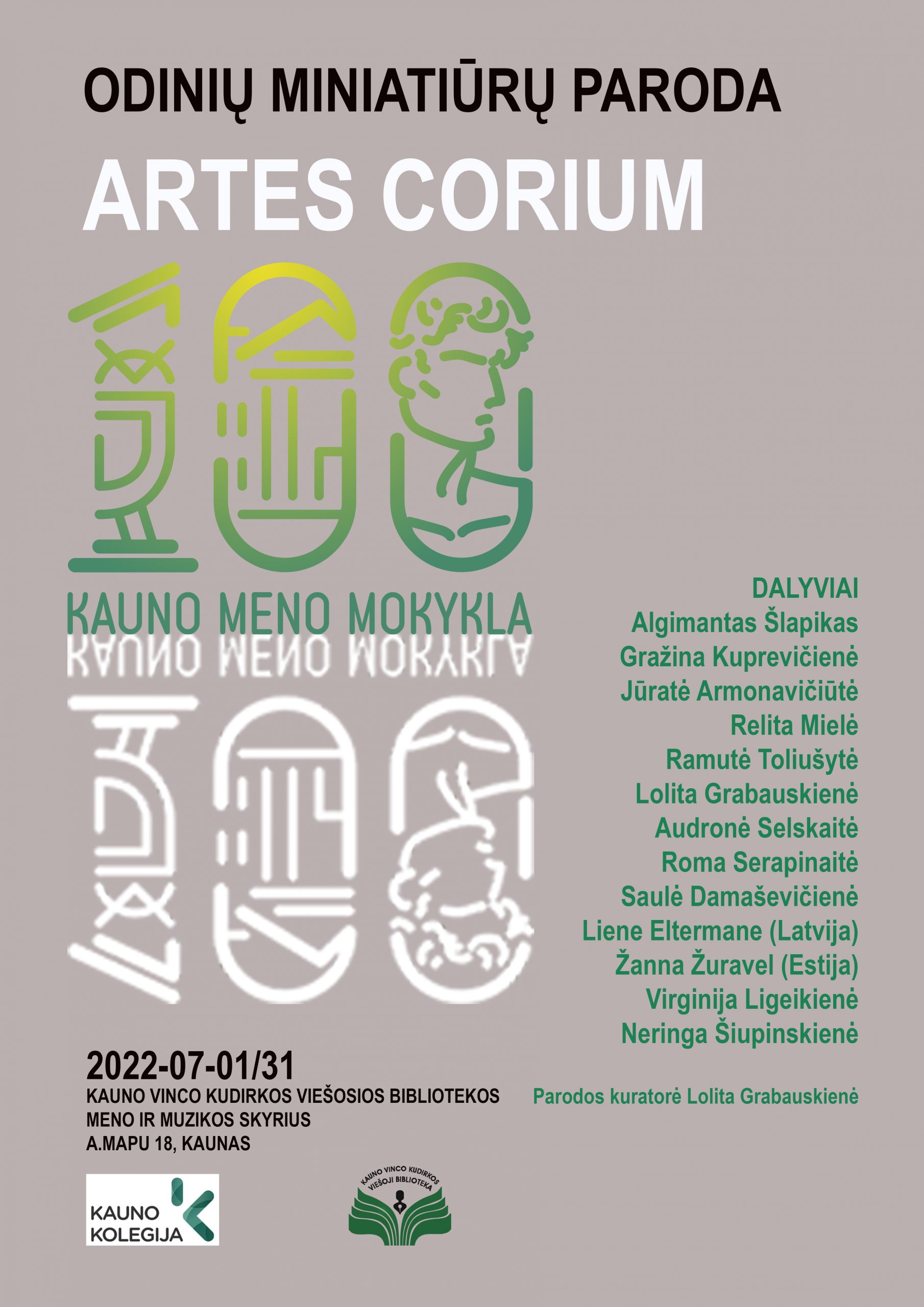 Liepos 1 d. 17 val. Vinco Kudirkos viešosios bibliotekos Meno ir muzikos skyriaus ekspozicinėse erdvėse (A. Mapu g. 18, Kaunas) atidaroma Kauno kolegijos Menų ir ugdymo fakulteto Menų akademijos Stiklo, keramikos, odos, tekstilės meno studijų programos lektorės, odos menininkės Lolitos Grabauskienės kuruojama tarptautinė odos miniatiūrų paroda „Artes Corium”, kurioje dalyvauja ir programos dėstytoja Neringa Šiupinskienė. Paroda dedikuojama Kauno meno mokyklos įkūrimo 100-mečio jubiliejui.