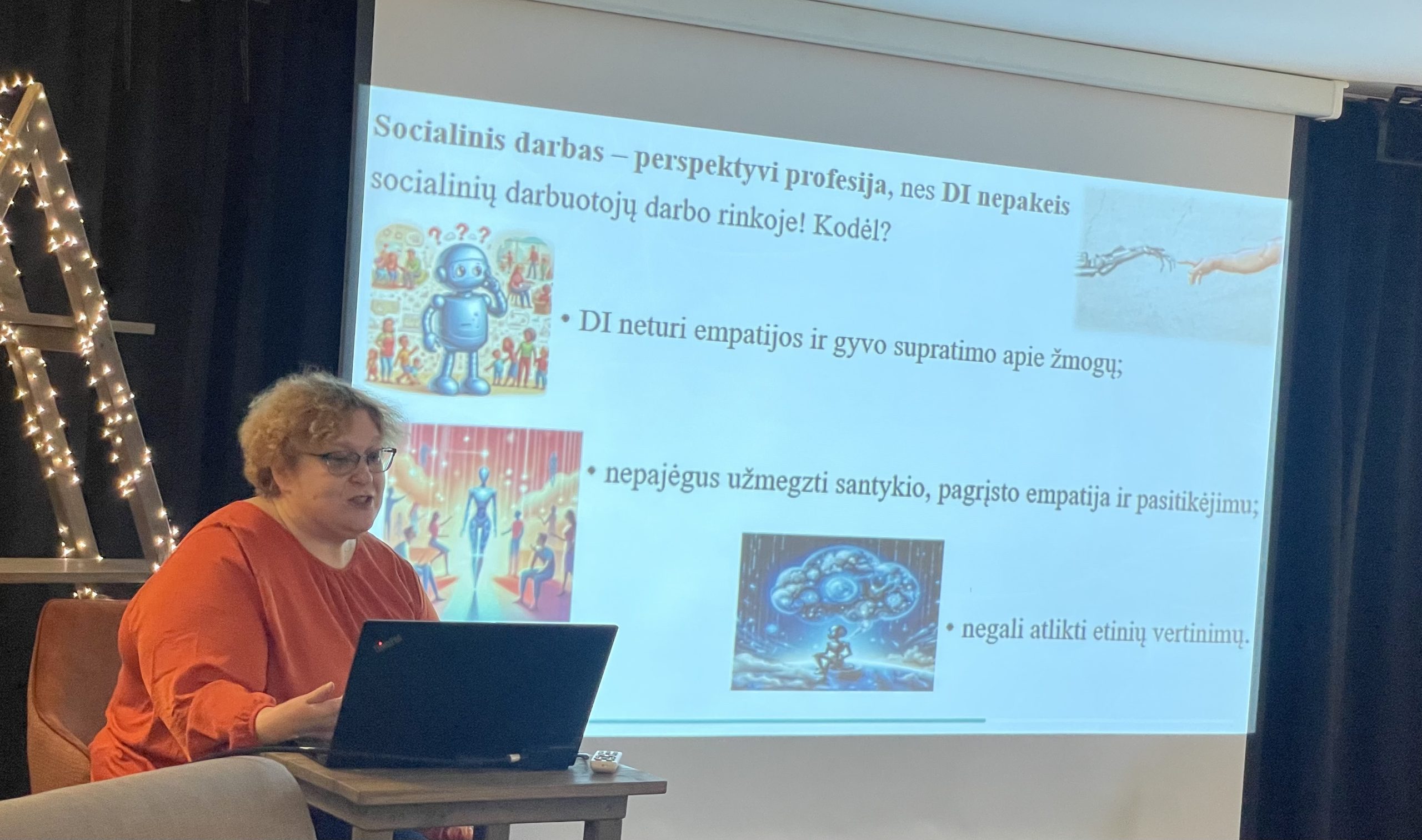 Teminiuose pranešimuose doc. dr. Salomėja Karasevičiūtė ir doc. dr. Valentina Demidenko kalbėjo apie socialinio darbuotojo vaidmens kaitą ir perėjimą nuo tradicijų prie inovacijų. Greta Medelienė ir Virginija Kondratavičienė dalijosi patirtimi teikiant kokybiškas dienos socialinės globos paslaugas senyvo amžiaus asmenims, turintiems demenciją. Vitalija Šlepavičienė pristatė socialinių dirbtuvių „Draugų kiemelis“ veiklos naujoves ir iššūkius, o Rasa Piečienė akcentavo technologijų svarbą ir jų poveikį socialinio darbo praktikai.