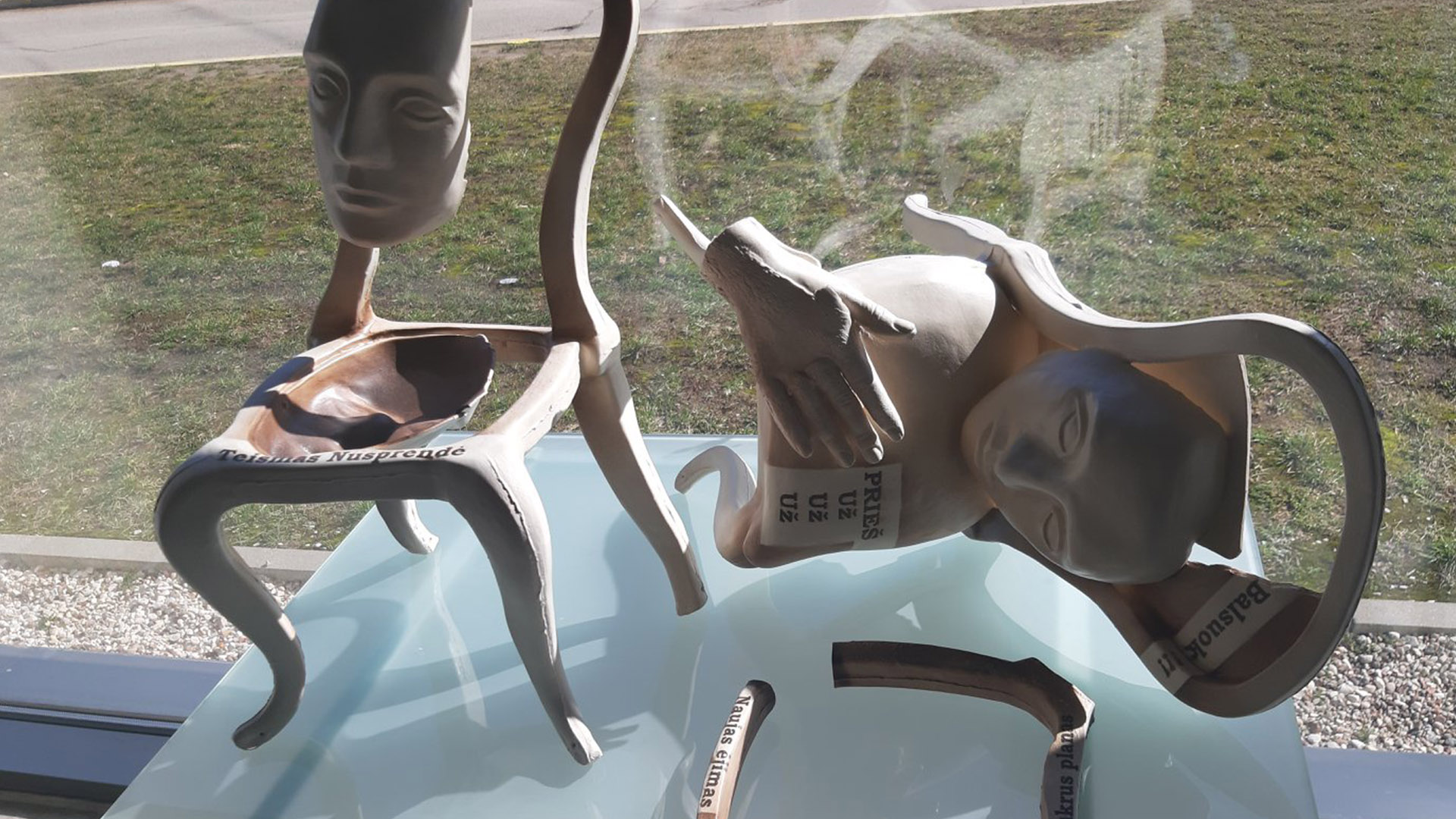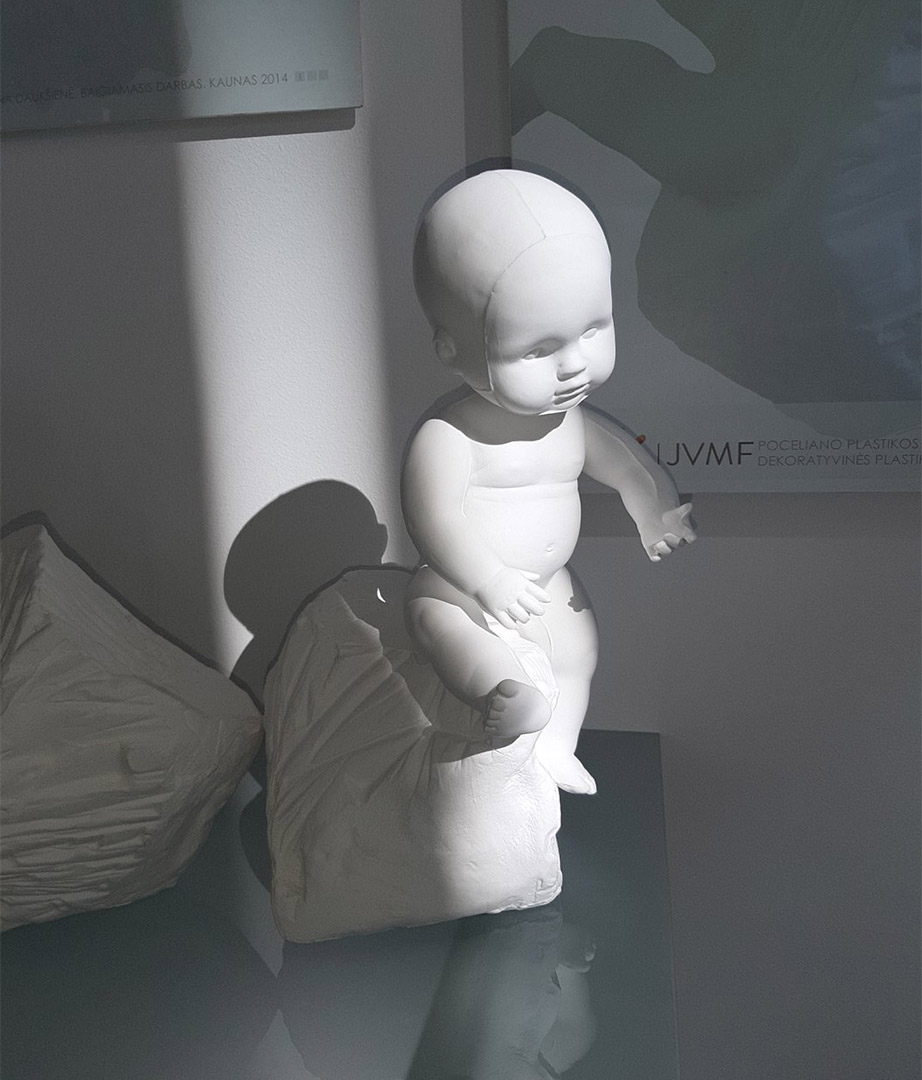 Absolventė Anželika Mikalauskaitė parodoje pristato dekoratyvinę stiklo kompoziciją „Emocionalūs šachmatai” (vad. Sigita Grabliauskaitė). Metafora į šachmatų žaidimą norima atkreipti dėmesį į žmogaus pasimetimą tarp populiariosios kultūros formuojamų stereotipų, skatinamo materialumo, nuomonės formavimo ir t.t. Dekoratyvinė stiklo kompozicija „Emocionalūs šachmatai” tai – unikalios stiklo skulptūros, įgyvendintos stiklo klampinimo formose būdu. Vienetinių kūrinių gamybos technika pasirinkta norint atskleisti figūrų savitumą, akcentuojant skirtingas emocijas, kurias išreiškia kiekviena šachmatų figūra. Absolvento Paulius Jurjono baigiamasis darbas dekoratyviniai stiklo suvenyrai „Kauno Kurčiųjų jaunimo organizacijai – 10 metų“ (vad. Sigita Grabliauskaitė) tai – penkios skulptūrinės kompozicijos, sukurtos iš keturių žmogaus plaštakų atliejų, rodančių gestų abėcėlės raides, iš kurių susideda paprastas, tačiau gražus ir svarbus žodis kiekvienam iš mūsų – „ačiū“. Kūrinyje atsiskleidžia meistriškas P. Jurjono moliravimo technikos įvaldymas, jos galimybės.