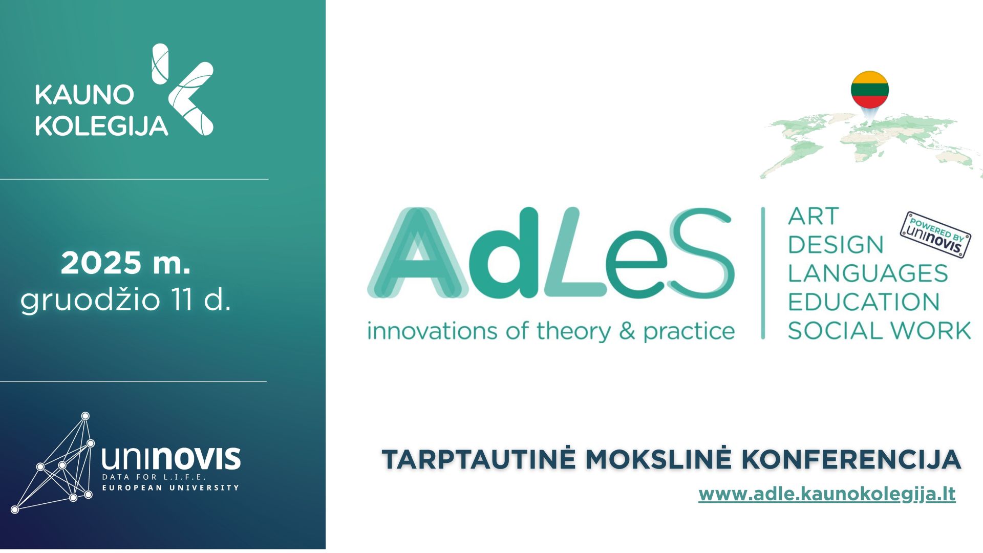 Tarptautinė mokslinė konferencija ADLES Powered by UNINOVIS 2025. Menas, dizainas, kalbos, ugdymas ir socialinis darbas: teorijos ir praktikos inovacijos vyks gruodžio 11 d., 10 val., 407 aud., Kauno kolegijoje (Pramonės pr. 22A, Kaunas). Norėdami dalyvauti – užpildykite registracijos anketą. Dalyvių registracija – iki gruodžio 10 d.